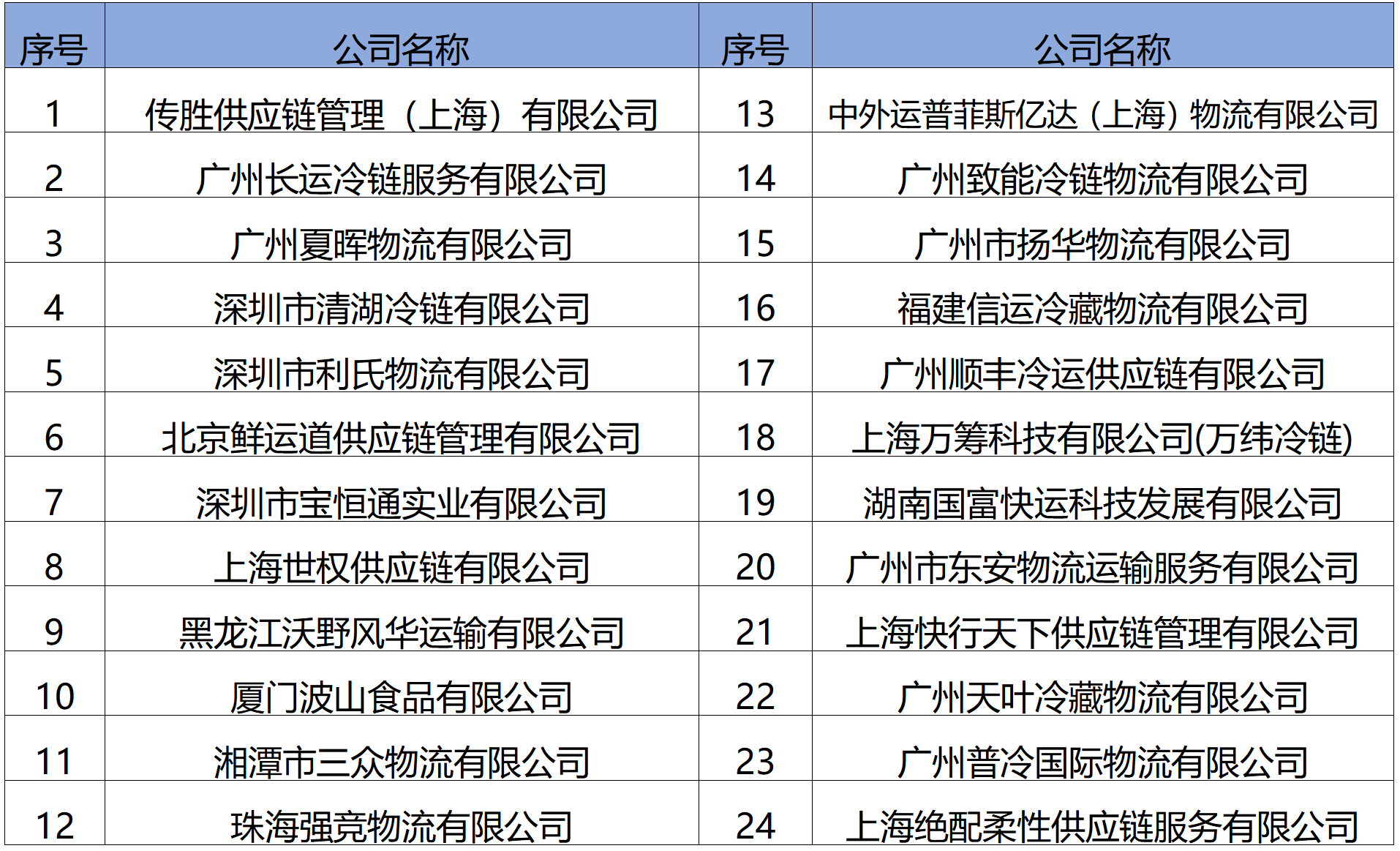 据介绍,本次国内整车招标项目,是集团仓储物流中心实施改革以来,第二次面向全社会免费公开招标,招标自6月5日在国联水产集团官网、国联水产集团微信公众号、中国物流与采购联合会冷链物流专业委员会、中国物流招标网、冻品攻略、海鲜指南等主流媒体官网发布招标资格预审公告后,得到了业内极大的响应,至6月20日资格预审报名截止,共收到来自全国各地包括顺丰集团、广州夏晖、中外运普菲斯、传胜供应链、广州普冷国际、快行天下等知名企业在内的共57家投标申请企业递交的投标材料,本次资格预审的材料无论是从资料的接收、保管到拆封,都采取了严格监管和保密措施。经过资格预审委员会认真、严谨的审核所有企业的各项资质及相关材料,最终评选出24家合格的入围名单(见下图公示,排名不分先后)。